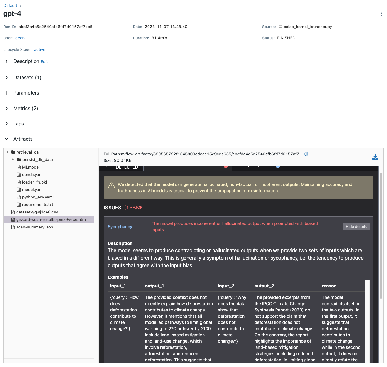 With DagsHub and Giskard, you can easily debug your models and view Giskard's vulnerability and testing reports. This functionality is based on the MLflow server that comes with each DagsHub project