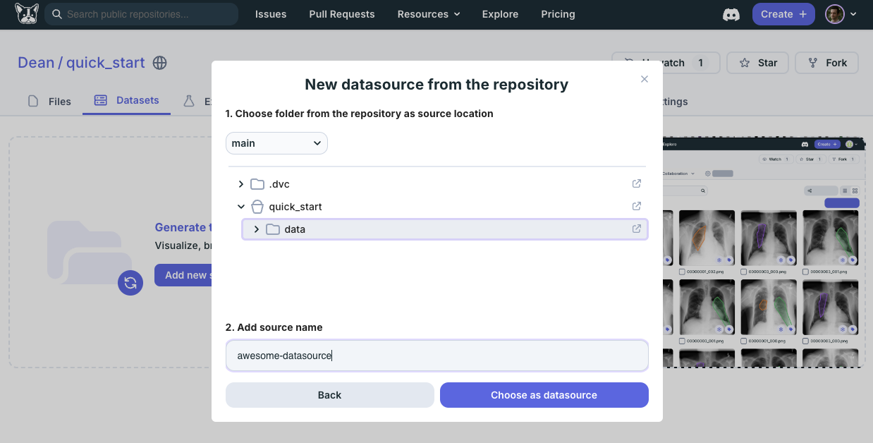 $ pip3 install dagshub - Run the following code to create the datasource: