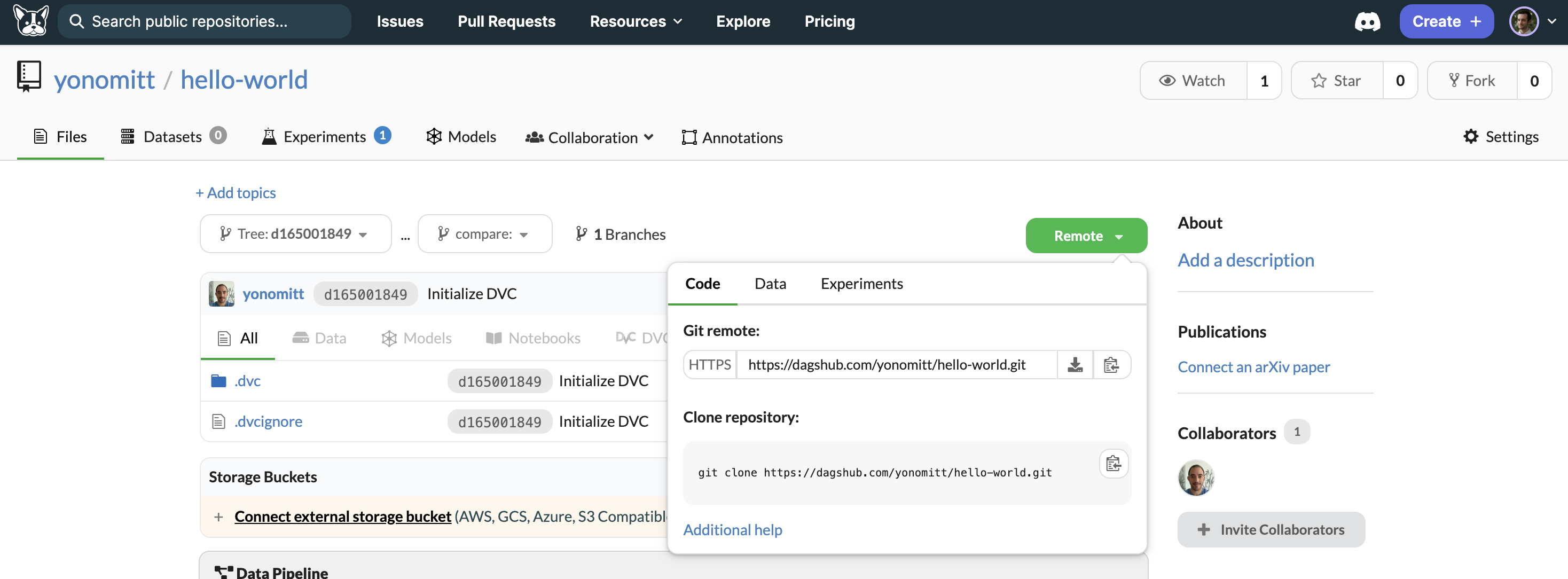 Now, we'll clone the Git remote, which is stored on DagsHub, to our local computer.