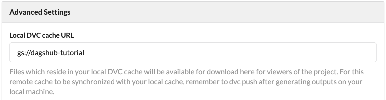 and add the link to the bucket in the Advanced Settings Local DVC cache URL. In our case it looks something like this: