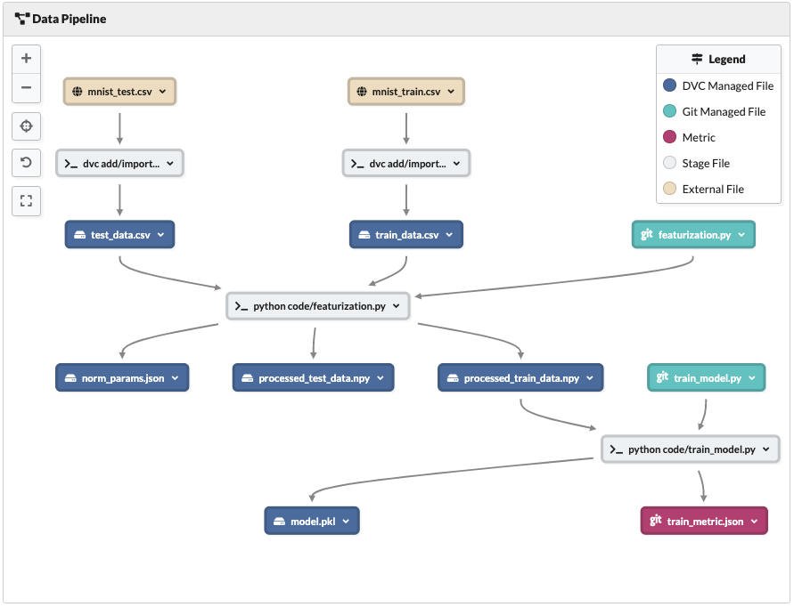 .dvcfiles are always checked into the git repo. - The command that created this stage. We may truncate it if it's too long. In this case, the command is just a dvc add or import. Later in the tutorial, we will see stages where the command is more complex and defined by the user.
