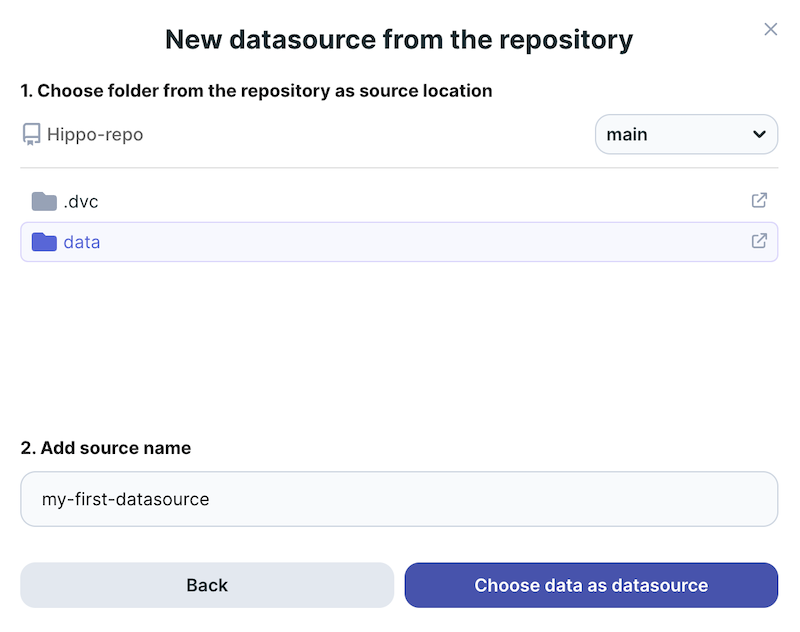 repo- a string with the repo owner and name of the repository you want to work on.name- the name you want to give to your data source.path- the path of your data folder inside your repository, relative to the repo root. Data Engine will scan all files in this folder, and create the datasource from them.