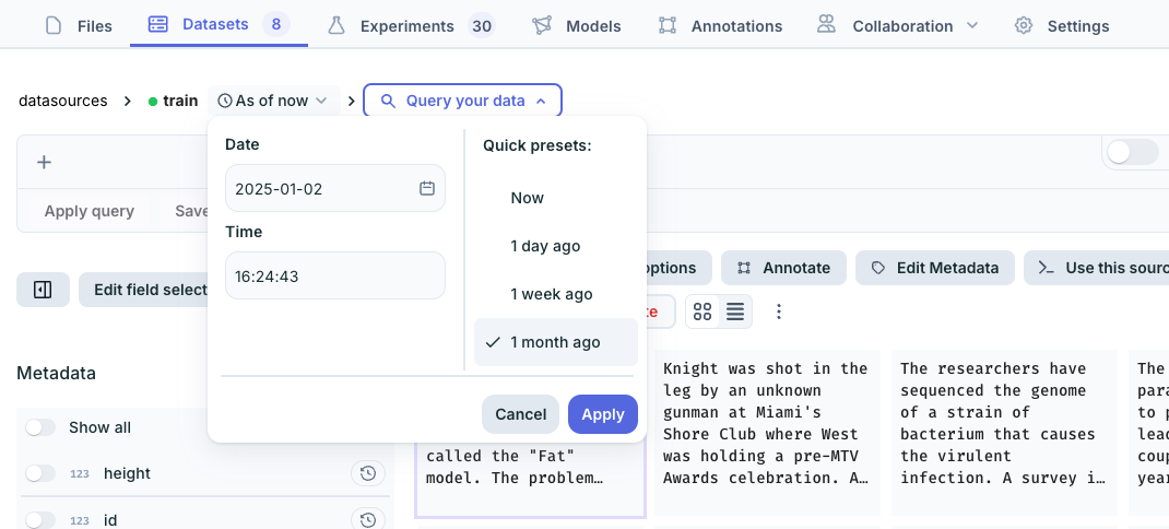 2. Data is add-only, and metadata changes (for example annotations) , but data files themselves don't change (this is the most common use case) – In this case dataset versioning is required.